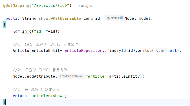 이제 이 내용을 웹페이지에서 확인하기 위해 id로 url 요청을 했을 때 받아줄 컨트롤러를 만들어보자.